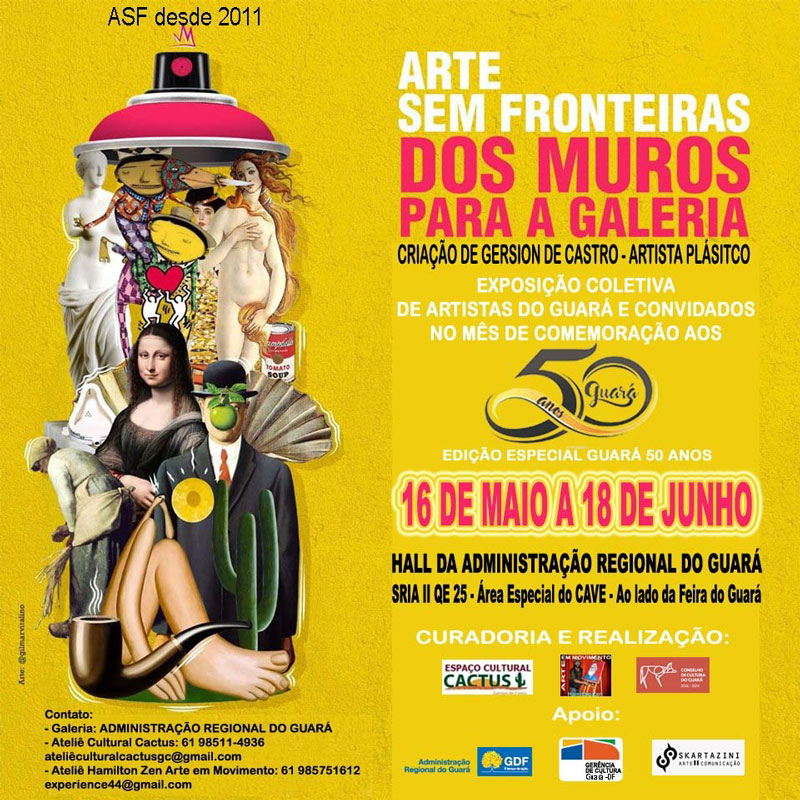 A mostra coletiva Arte sem Fronteiras dos Muros para a Galeria reúne 50 obras e artistas do Guará e convidados de outras Regiões Administrativas do DF e Entorno, das mais variadas tendências e estilos, dentre artistas de rua como: muralistas e grafiteiros e artistas plásticos e visuais, desenhistas e tatuadores, que acontecerá no Hall da Administração Regional do Guará, em uma edição especial no mês de comemoração aos 50 anos do Guará.
