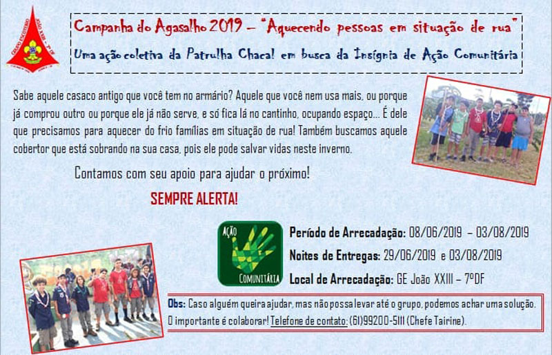 Desde o dia 8 de junho os escoteiros do Guará têm se empenhado para arrecadas agasalhos e cobertores para pessoas em estado de vulnerabilidade social.