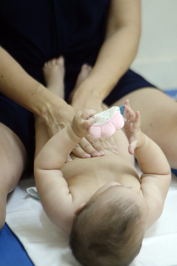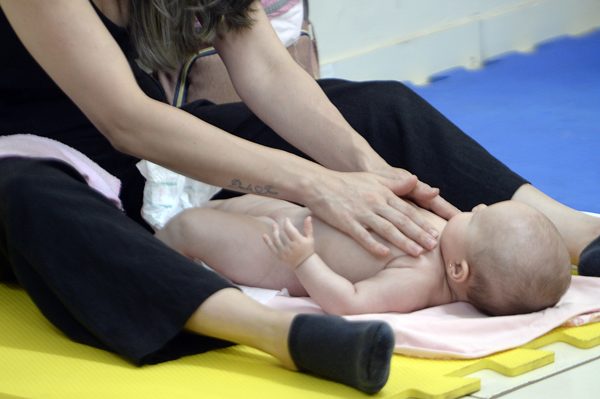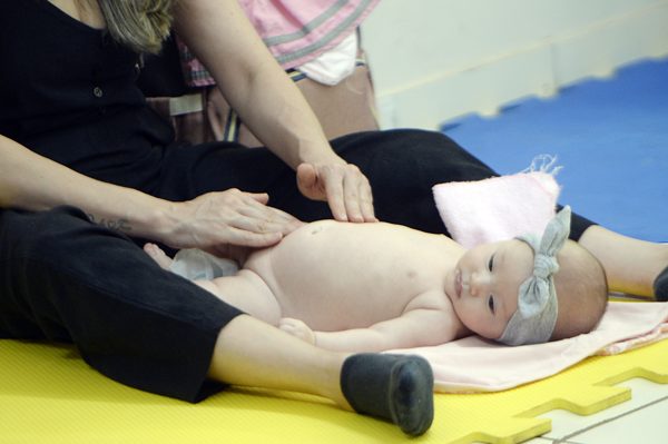 A professora Queilane de Lima, de 36 anos, participa pela segunda vez da sessão. Mãe de Katarina de Lima Viana, de três meses, ela diz estar gostando muito da técnica. “É meu terceiro filho, mas o primeiro com quem faço a experiência”, revela. “Ela é bem nervosinha, e sempre fica relaxada. Quando está zangada em casa, faço [a massagem] e ela fica mais calma. Além disso, solta os gases”.