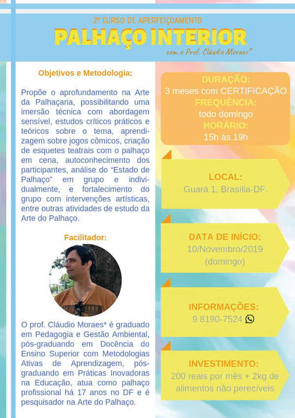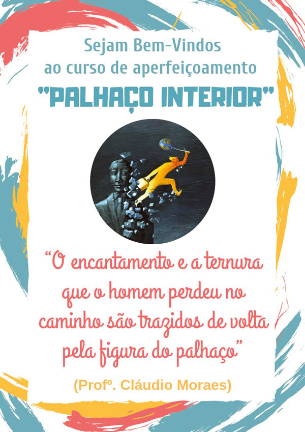 O Curso de Aperfeiçoamento Palhaço Interior é um aprofundamento na arte do palhaço, que possibilita uma imersão técnica nessa arte terapia vinda do palhaço, figura arquetípica que surgiu há mais de 4 mil anos. “Passaremos por estudos teóricos e práticos sobre o tema, pela aprendizagem com jogos cômicos, criação de esquetes teatrais com o palhaço em cena, autoconhecimento e autoaceitação dos participantes por meio do estado de palhaço”, resume o professor.