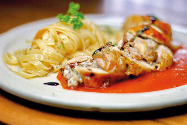 - Chicken Italian (Filé de coxa de frango recheado com queijo ao limão siciliano, assado com molho de tomate. Acompanha espaguete na manteiga de alho R$ 33)