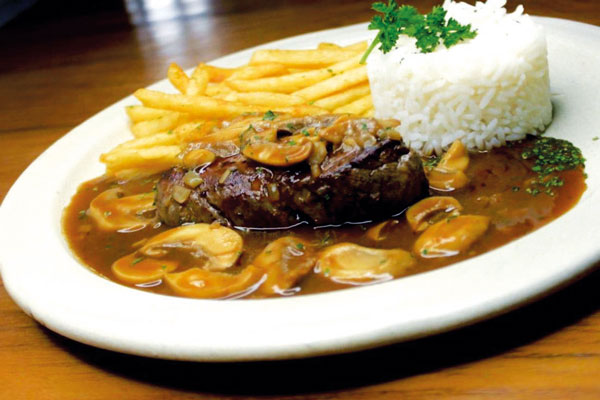 - Filé com fritas (Filé mignon grelhado ao molho roti com champignon, guarnecido de arroz e fritas R$ 40)