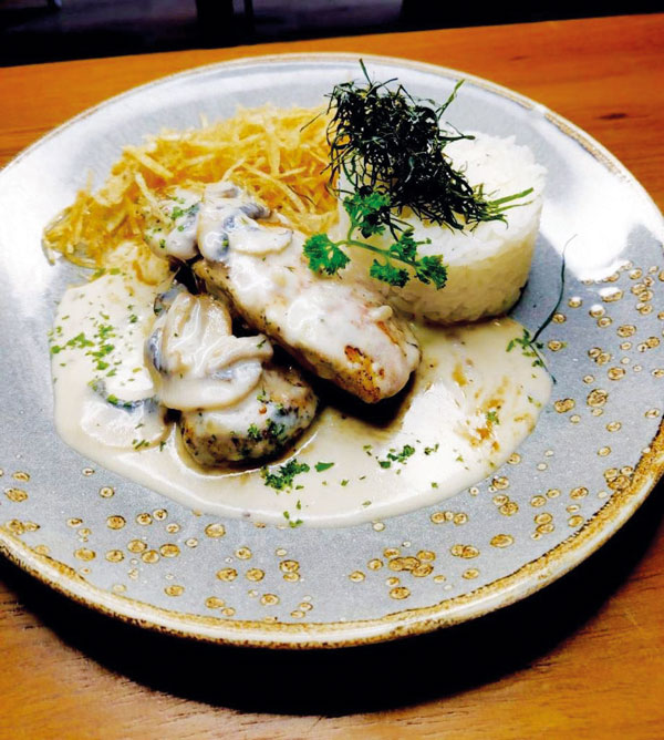 - Frango ao molho cremoso (Filé de peito de frango grelhado ao molho cremoso de parmesão e cogumelos frescos guarnecido de arroz branco e batata palha R$ 40).