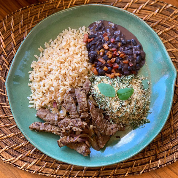 O brasileirinho, com acém em tiras com cebola, arroz integral, feijão preto e farofa de couve com um toque especial de bacon (R$ 18,80), sem glúten e lactose e 400 gramas.