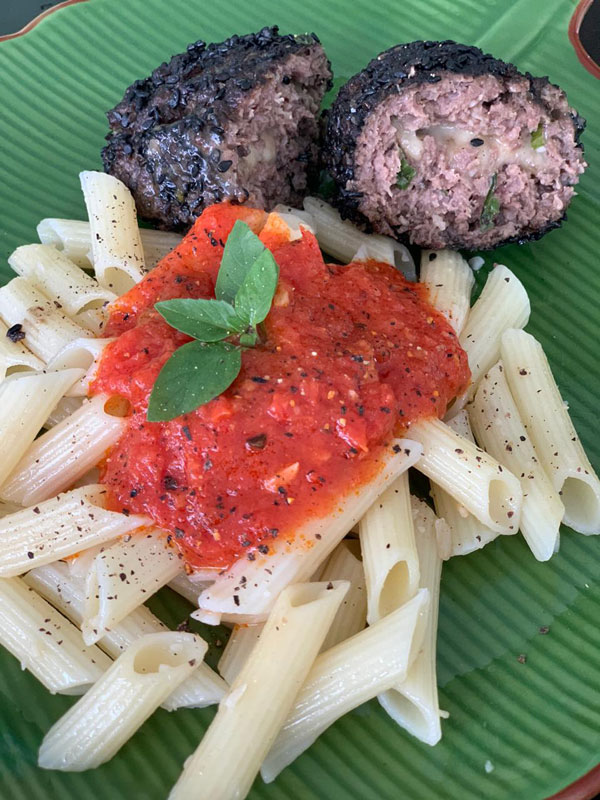 Há ainda, uma opção de massa. Polpetone com macarrão de arroz e molho de tomate caseiro (R$16), com 250 gramas. O prato contém lactose e é sem glúten.