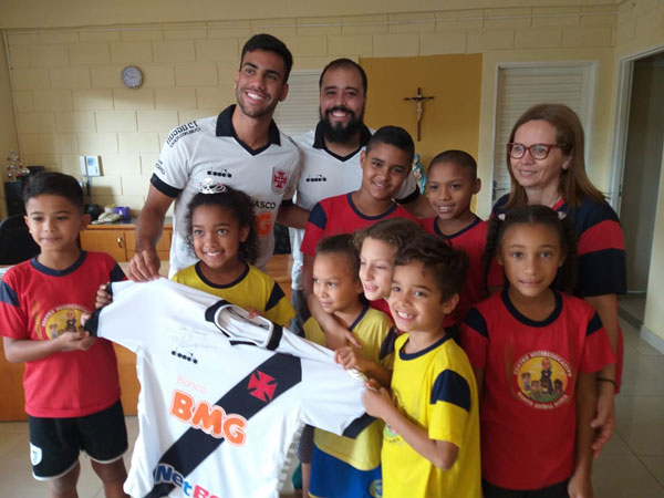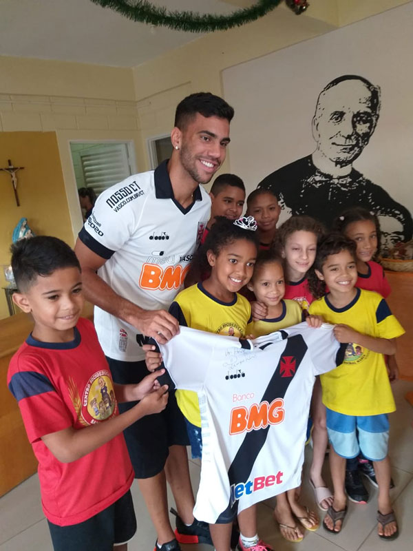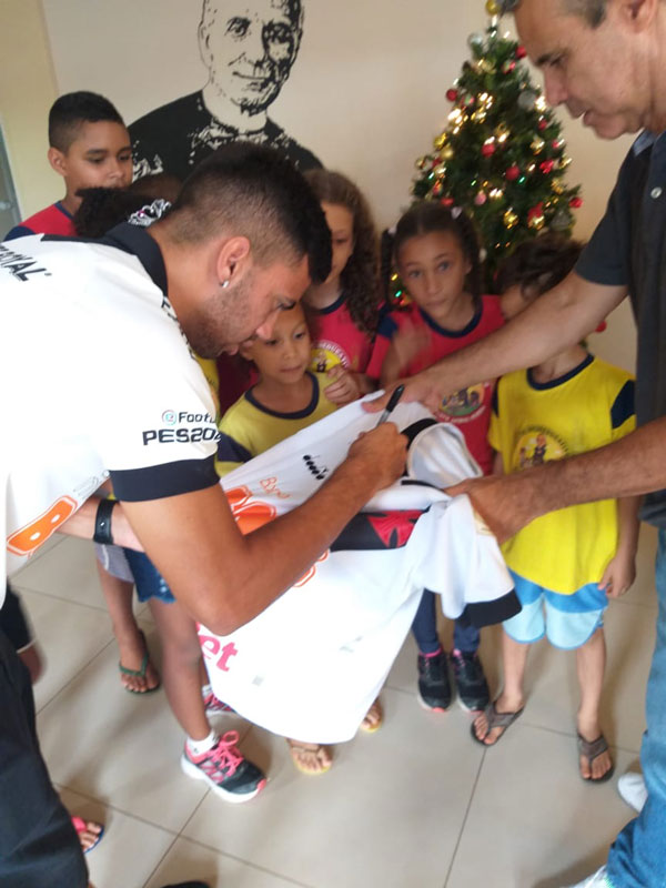 O jovem atacante cruzmaltino Tiago Reis, de 20 anos, esteve na creche Santo Aníbal, que atende 240 crianças carentes no Polo de Moda, na tarde de hoje, 10 de dezembro. O jovem jogador é muito ligado a causas sociais e tem atuado em comunidades carentes sempre que tem tempo. Tiago conversou com as crianças, contou sobre a carreira e presenteou a creche com um camisa autografada do Vasco da Gama para que seja sorteada. Os pais do jogador, Edvaldo e Janaína Reis, moram no edifício Olympique, na orla do Guará II.