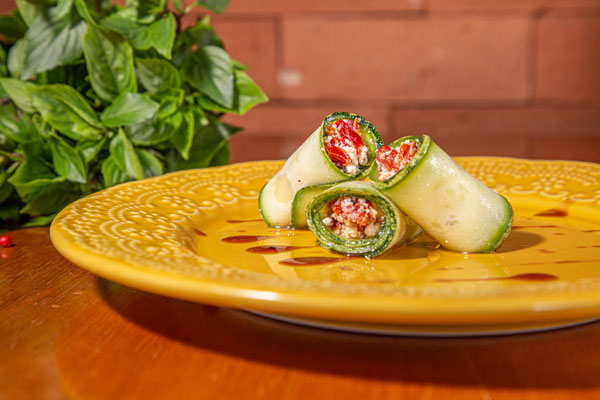 - um involtini de abobrinha com ricota, tomate seco e gergelim