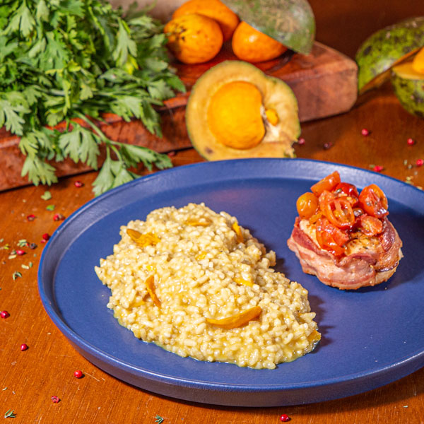 - risoto de pequi acompanhado de medalhão de frango e tomate confitado