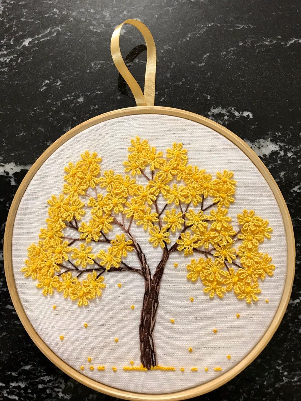 Ipês para todos os gostos: Embora tenha um repertório bastante variado de pontos e Marias já bordadas, que pode ser visto no perfil da marca, no Instagram, o carro-chefe são os ipês. “A exuberância do ipê amarelo sempre chama a atenção, assim como a realeza do branco e o romantismo do rosa e do roxo. Tem até ipê colorido para quem não quer ter que decidir entre um e outro. Além de incríveis, os ipês são, na minha opinião, ‘seres’ que nos ensinam muito, especialmente a resiliência, pois na época mais quente e seca do ano, é quando eles explodem para nos mostrar que a gente pode esperar uma manhã melhor, sempre”.