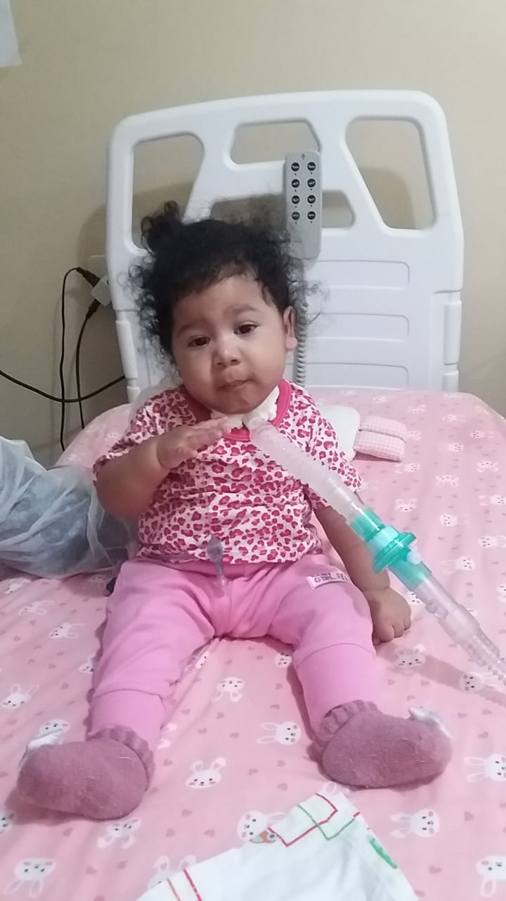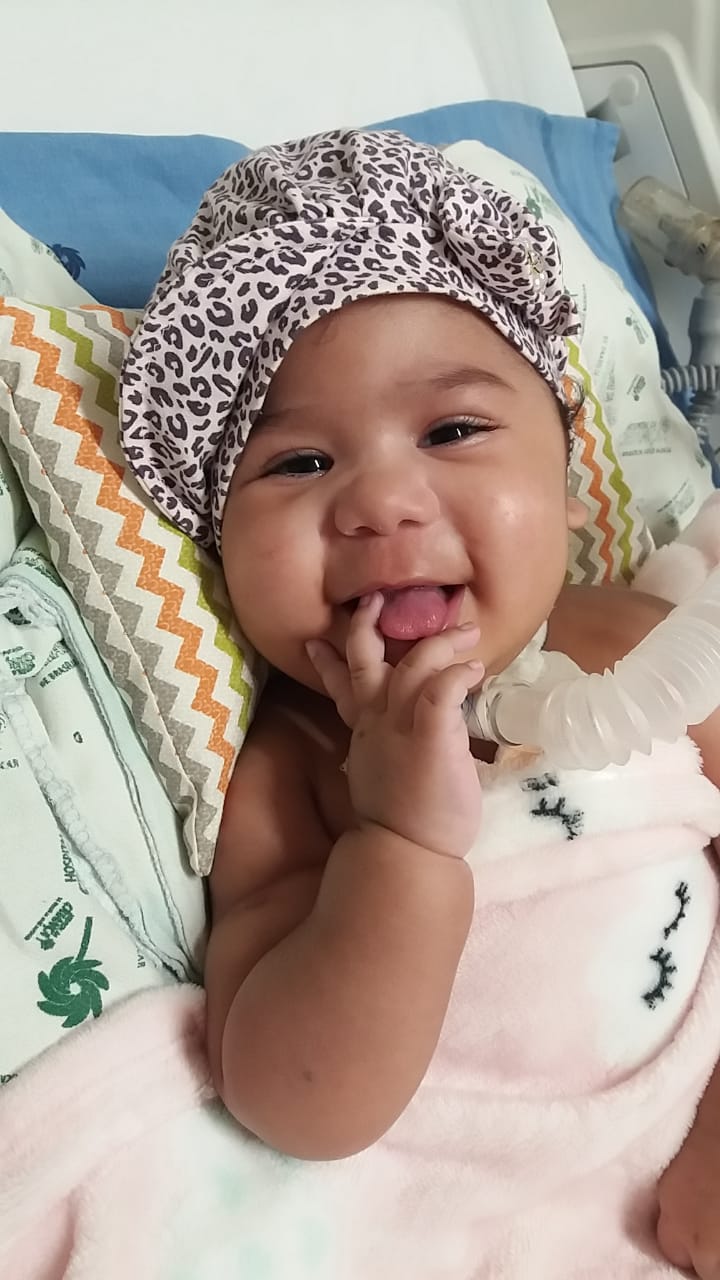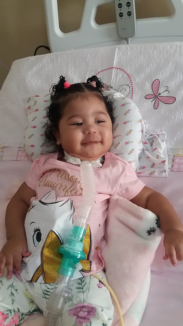 Ao apresentar piora no quadro respiratório, a bebê Isabel dos Santos precisou usar o respirador pulmonar a partir dos 4 meses de vida. Ficou internada na Unidade de Terapia Intensiva (UTI) do Hospital da Criança durante quase três meses. “Nesse período, ficamos esperando chegar a primeira dose do remédio Spinraza, também usado no tratamento de AME. Já tínhamos dado entrada na Farmácia de Alto Custo no dia 25 de fevereiro e torcendo para conseguir. Enquanto isso, a Isabel ficou usando a ventilação não invasiva de girafinha e fazendo diversos exames”, conta Rayssa.