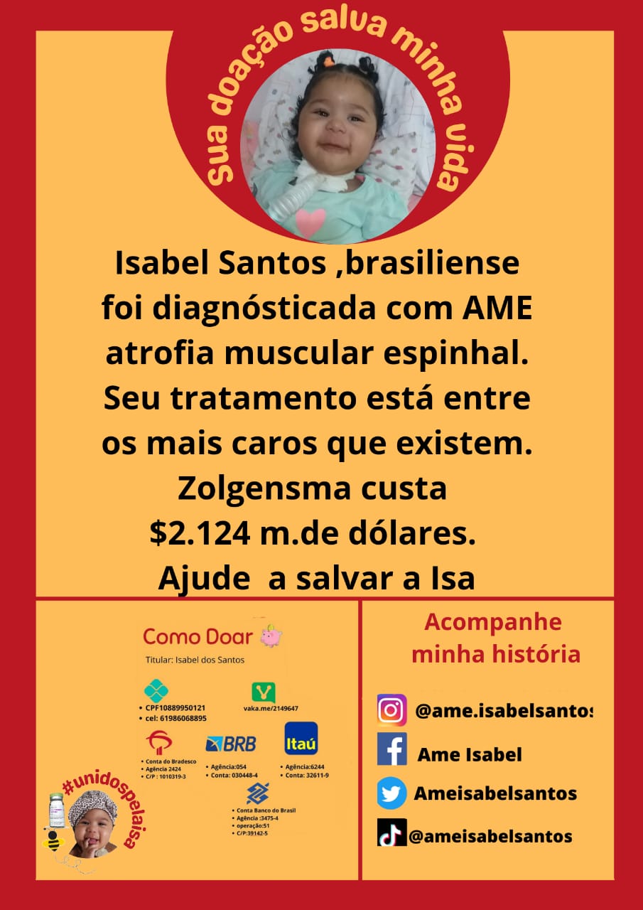 É uma doença degenerativa, rara, neuromuscular, grave e irreversível que interfere na produção de proteínas essenciais para a sobrevivência dos neurônios motores. Tais neurônios são responsáveis pelos movimentos voluntários vitais simples, como respirar, engolir e se mover. Todas as informações sobre a luta da Isabel estão na página do Instagram movimentada pela família: @ame.isabelsantos