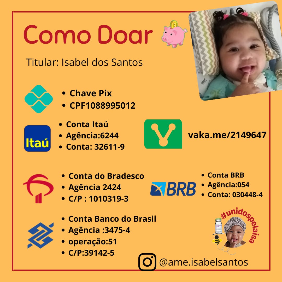 “Eram muito parecidos com os que a irmãzinha dela apresentou anos atrás. O que conforta a gente agora é que a medicina está mais avançada. Estamos otimistas e esperançosos de que a Isabel conseguirá tomar o remédio Zolgensma. A doação de cada pessoa fará muita diferença. Temos fé de que alcançaremos o milagre. Para Deus, nada é impossível”, garante. Também são filhos do casal: Samuel Lucas e Kamily Vitória, de 10 anos e 7 anos, respectivamente.