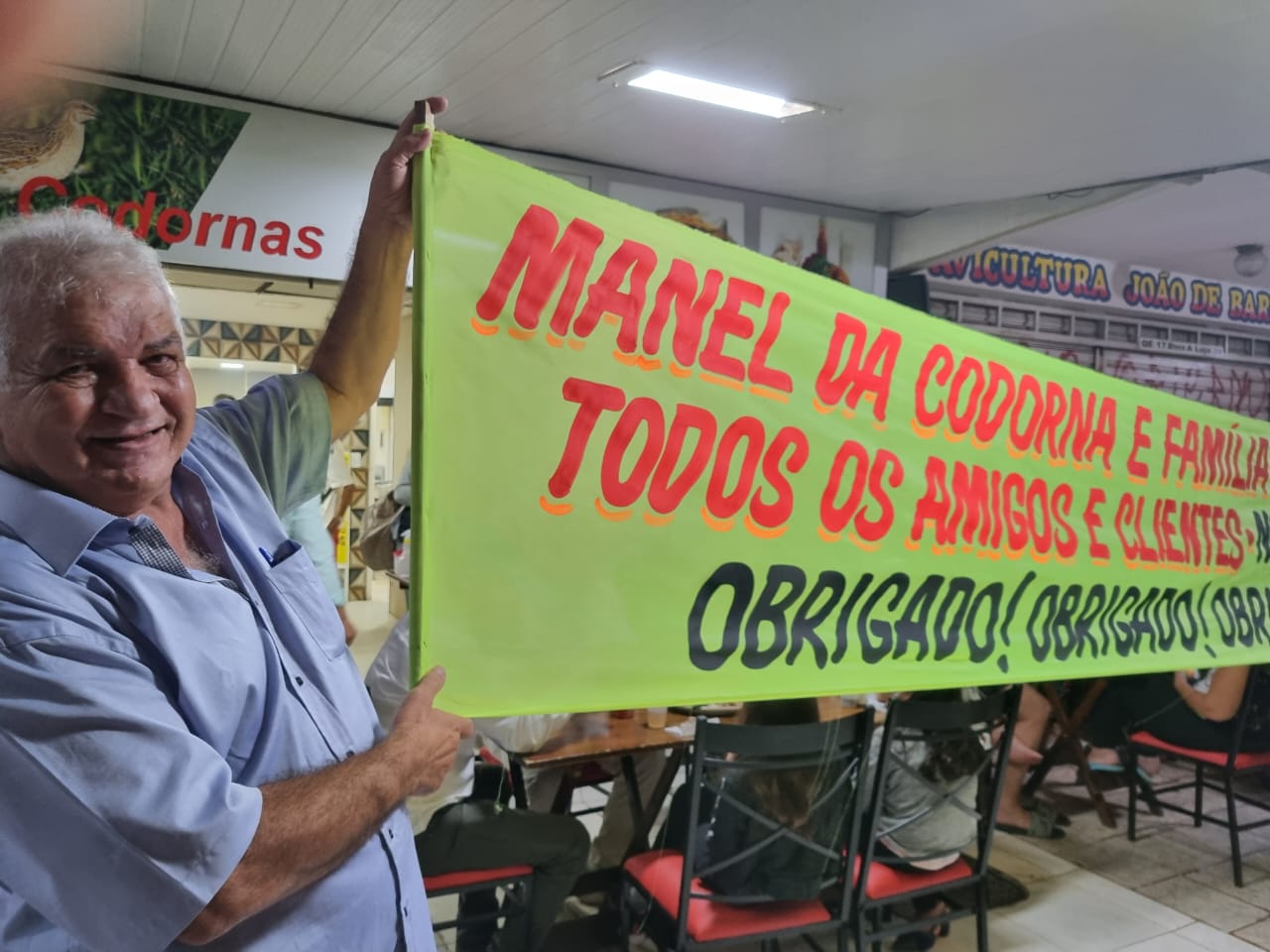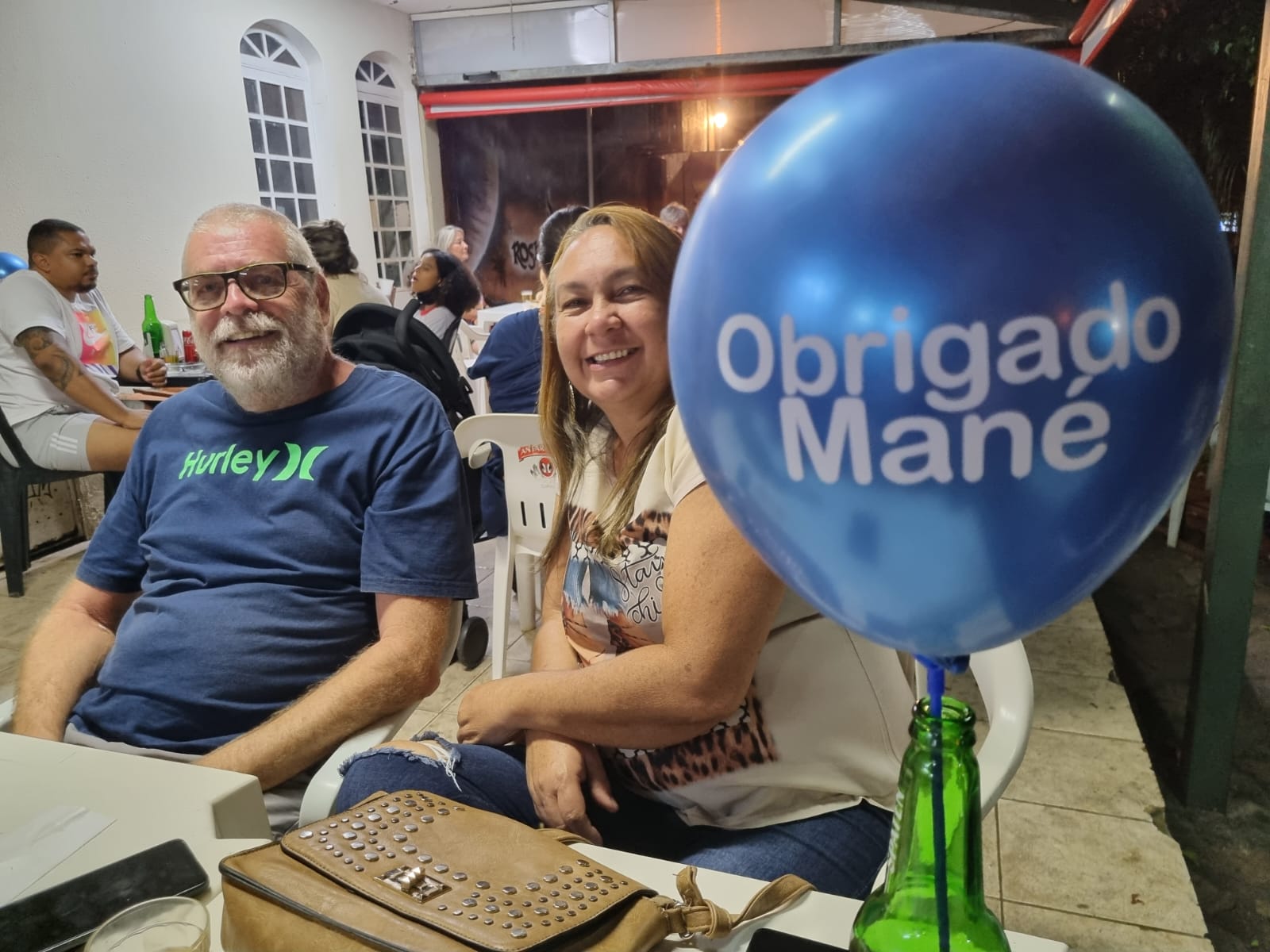 Emocionado, Mané, abraçava a todos, acompanhado da esposa Maria Izabel e do filho Douglas. Uma faixa, que ele e a Maria Izabel circulavam de vez em quando entre as mesas, completava o agradecimento. No final da festa, a família reuniu todos os funcionários para os últimos agradecimentos e foram ovacionados pelo público presente, em pé.