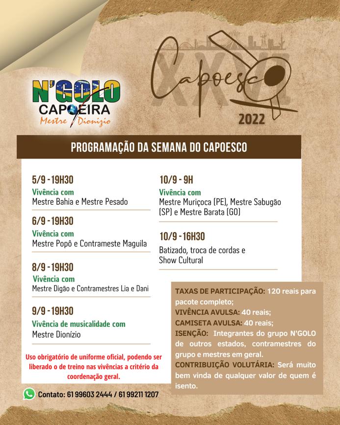 Promovido pelo Mestre Dionizio Pereira da Silva e seus alunos do Centro Cultural Arte e Luta N’GOLO Capoeira, o Capoesco oferece à comunidade oficinas de movimentações e musicalidades da capoeira e reunirá mestras e mestres, contramestres, professoras e professores de todo o DF e de São Paulo, Pernambuco, Goiás e outros.