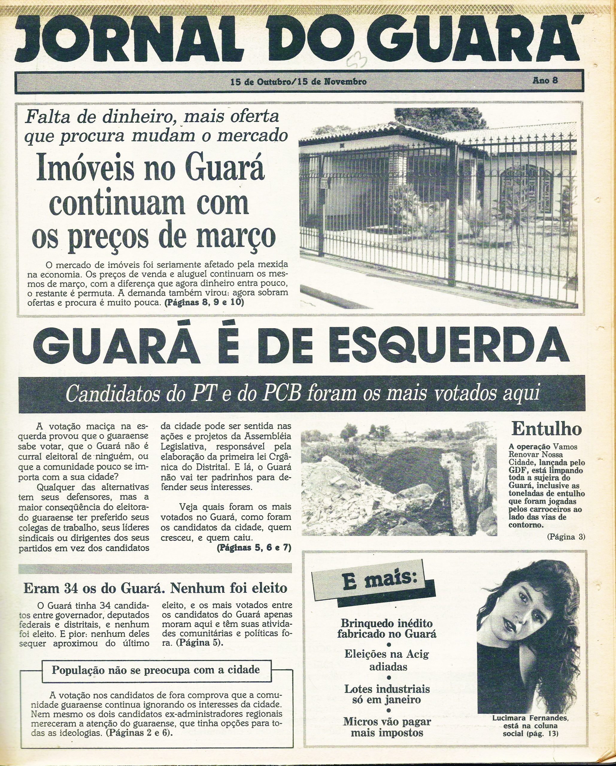Comecemos nossa análise pelas eleições de 1990, quando foi eleita a primeira bancada de deputados distritais da Câmara Legislativa. Na primeira eleição de Joaquim Roriz para governador – ele havia sido indicado pelo presidente José Sarney em 1986 – até mesmo o obscuro Carlos Saraiva e Saraiva, lançado pelo PT, conseguiu medir forças com o ex-governador biônico no Guará. Aliás, foi a única cidade do DF em que Saraiva praticamente empatou com Roriz – em todas as outras a diferença foi muito acima. A tendência do voto guaraense na esquerda se estendeu aos candidatos ao Senado, Valmir Campelo Bezerra, que fazia dobradinha com Roriz, e Lauro Campos, do PT. Se dependesse do voto guaraense, o petista teria sido eleito, porque foram apenas o Plano Piloto e o Guará que deram votação a ele acima de Valmir Campelo. Para deputado federal, o comunista Augusto Carvalho foi, disparado, o mais votado no Guará. A cidade foi a única do DF em que o petista Lula venceu Fernando Collor, o “caçador de marajá”, por mil votos a mais, diferença considerável para um colégio eleitoral de 53 mil votos da 9ª. Zona Eleitoral na época.