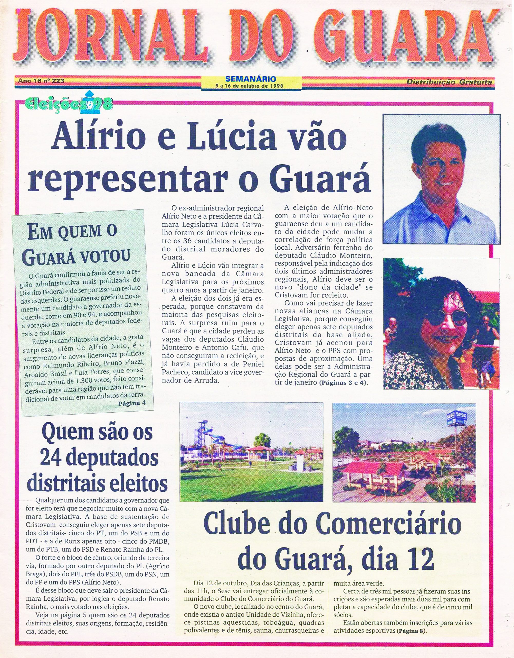 Em 1998, Lula voltou a ser mais votado no Guará do que Fernando Henrique Cardoso, com diferença de 11% a mais para o petista. Para o governo do DF, Cristovam Buarque, do PT, obteve 47% dos votos guaraenses, contra 32% de Roriz e 14% de Arruda. Para senador, a esquerdista Arlete Sampaio foi a preferida de 39,8% dos guaraense, contra 39,5% de Luis Estevão. Para deputado federal, pela primeira vez um candidato de direita ou centro obteve maioria na cidade, e esse feito coube a Jofran Frejat, com 6.675 votos, mas seguido de perto por Agnelo Queiroz, com 5.764 votos, representante da esquerda. Para a Câmara Legislativa, o guaraense preferiu votar em Alírio, então filiado ao PPS, que foi eleito pela primeira vez, com 4.530 votos na 9ª Zona Eleitoral. A tendência esquerdista da população guaraense se confirmava na votação dos cinco mais votados na cidade, na ordem Alírio Neto, Cláudio Monteiro, Maninha, Lúcia Carvalho e Rodrigo Rollemberg.