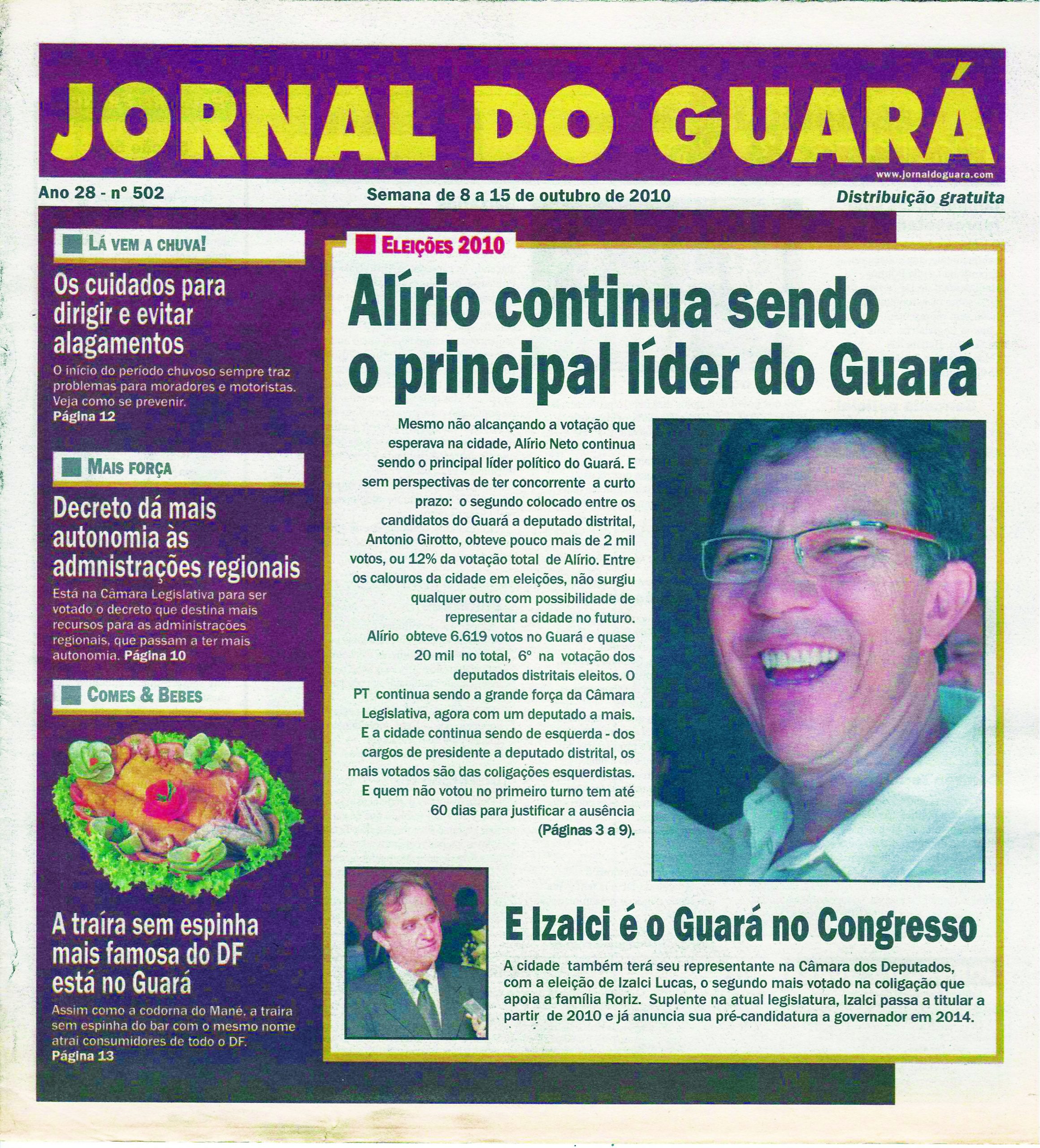 Em 2002, a esquerda deitou e rolou no Guará. Para quase todos os cargos, os candidatos esquerdistas receberam a maioria dos votos na cidade, com exceção de Arruda para deputado federal. O banho começou pelos candidatos à Presidência da República, quando Lula foi votado por 41.592 contra 13.531 de Ciro Gomes, 12.129 de Garotinho e 11.844 de José Serra. Para o Senado, Cristovam Buarque, do PT, recebeu 46.291 votos, contra 32.237 de Paulo Octávio, do PP, e incríveis 27.623 votos ao desconhecido Fredo, do PCdoB, na 9ª. Zona Eleitoral. Para o Governo do DF, Magela superou Roriz na cidade, por 36.150 a 29.997 votos, seguidos de Rollemberg, outro de esquerda, com 5.562 votos. Arruda, enfim, quebrou essa hegemonia da esquerda no Guará, ao ser o mais votado pelo guaraense com quase 18 mil votos, seguido de Tadeu Fillippeli, com pouco mais de 10 mil votos, e de Agnelo Queiroz, do PCdoB, com quase 10 mil votos. Para a Câmara Legislativa, Alírio confirmou o favoritismo, ao obter a maior votação no Gaurá para deputado distrital no Guará, com 5.389 votos, embora não tenha sido eleito por causa do quociente eleitoral, mesmo tendo ficado entre os 10 candidatos a distrital mais votados. Depois de Alírio, o candidato de centro Izalci Lucas, do PFL, conseguiu 3.530 votos, seguido de Arlete Sampaio, com 2.751 votos na cidade.