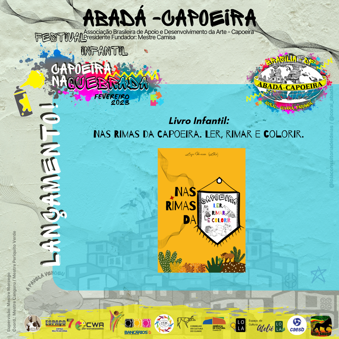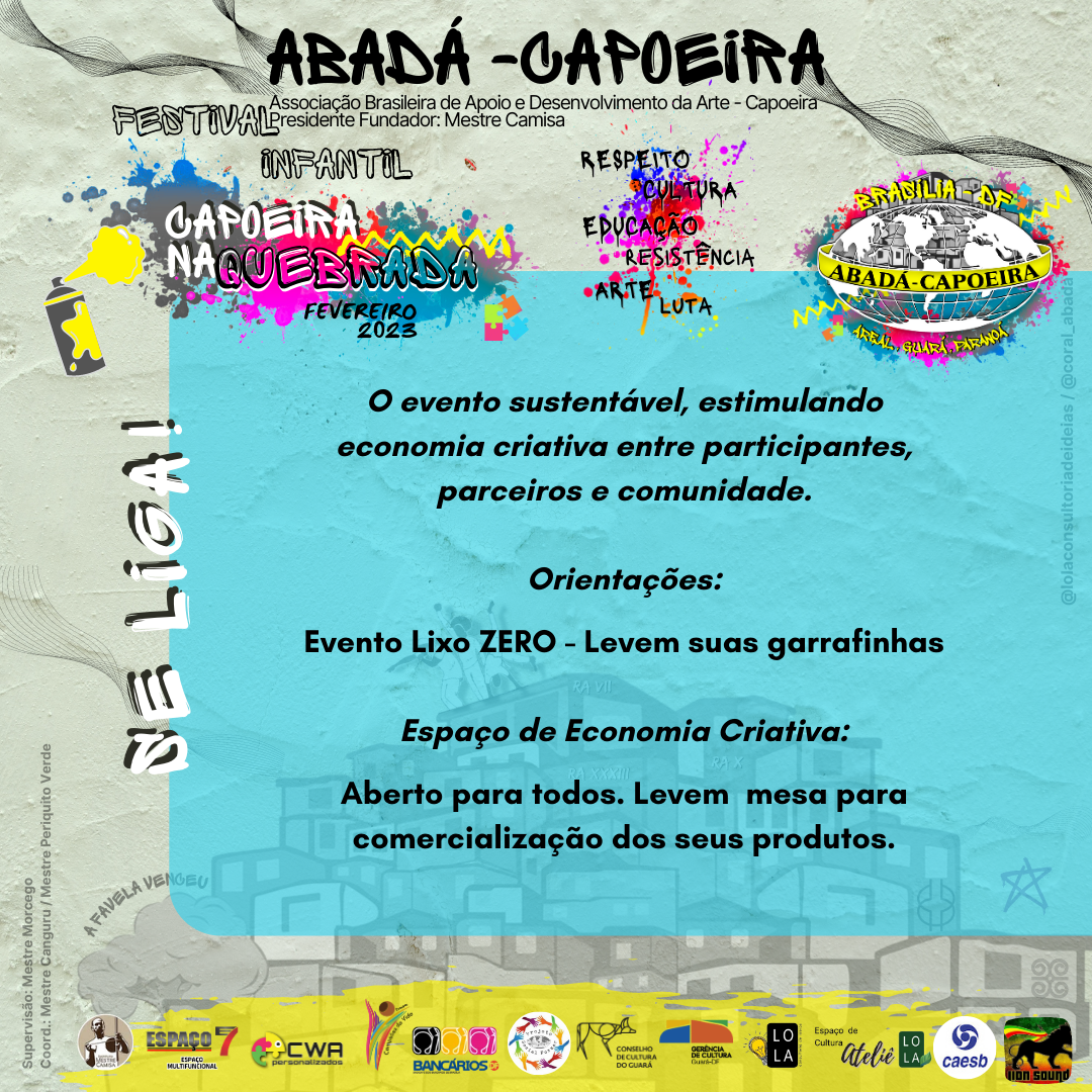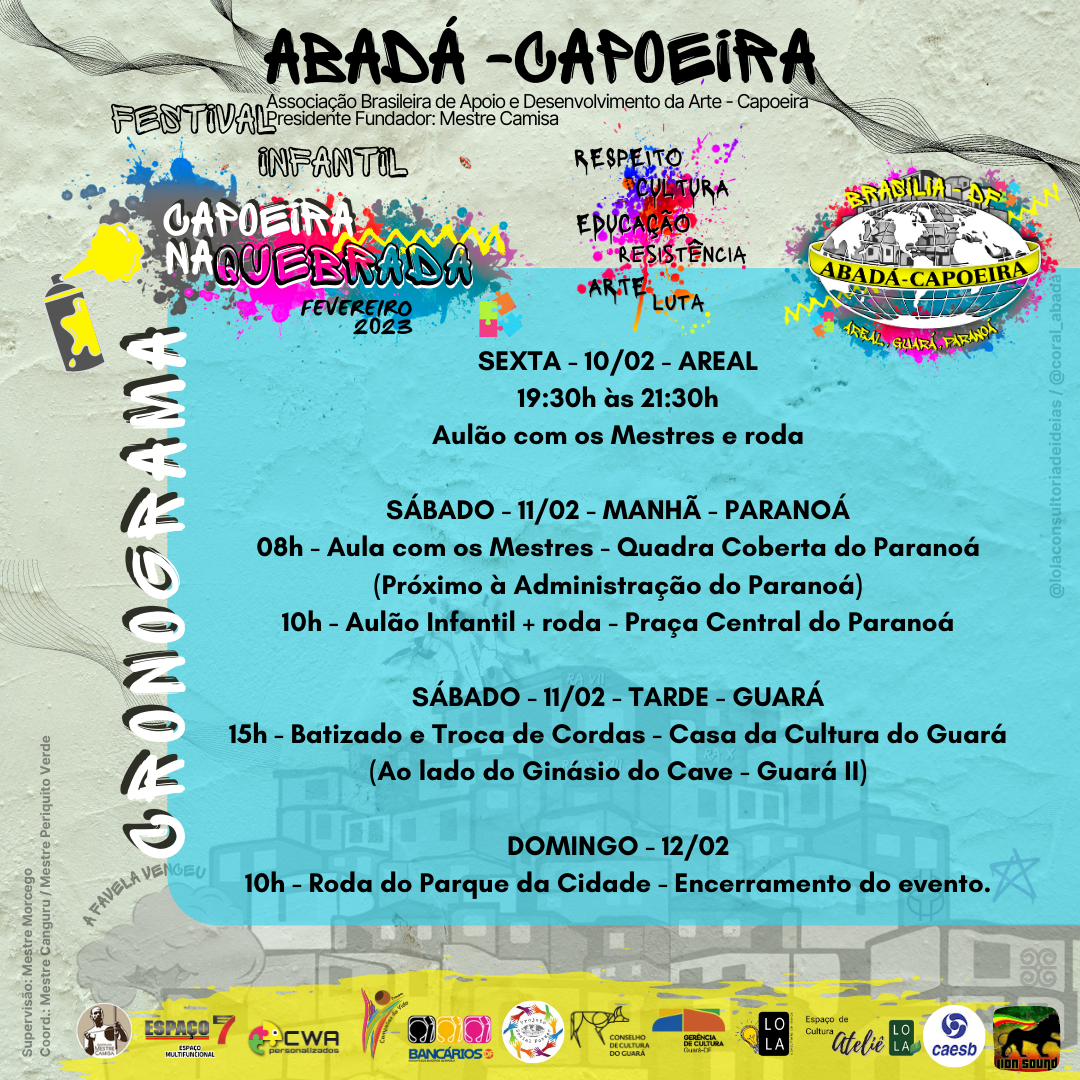 No próximo sábado, 11 de fevereiro de 2023, a partir das 15h, acontecerá na Casa da Cultura do Guará o “Festival Infantil Capoeira na Quebrada”, reunindo projetos sociais que utilizam da prática da arte Capoeira como ferramenta de criatividade, cultura, convívio, cooperação, respeito, disciplina, fundamento, conhecimento, musicalidade e solidariedade.
