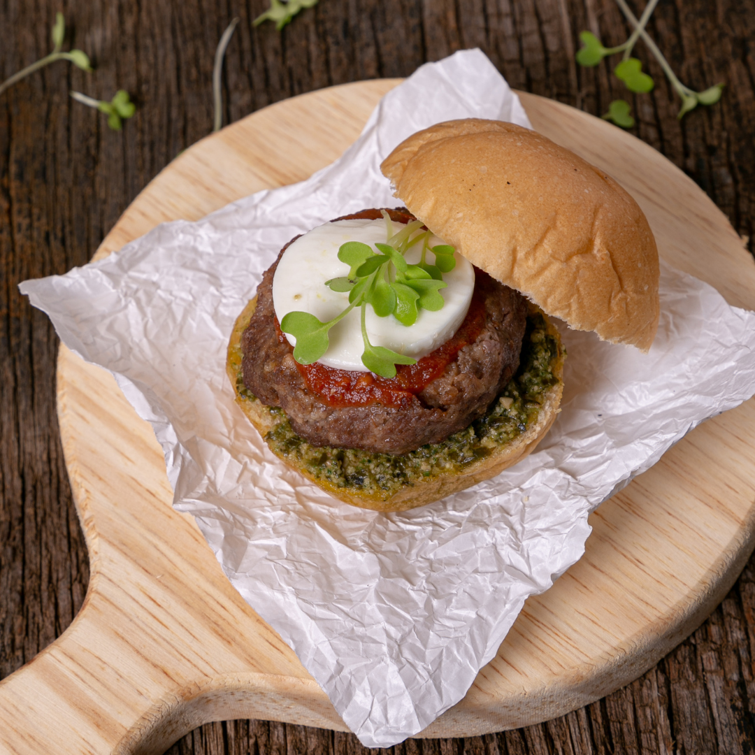 - Bomboloni Burger , pão de azeite, molho pesto , queijo ,molho Pomodoro, mini brotos