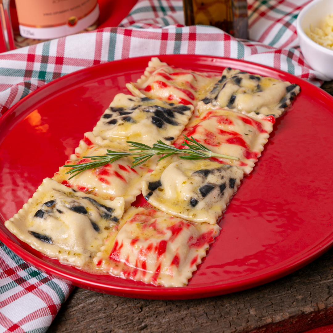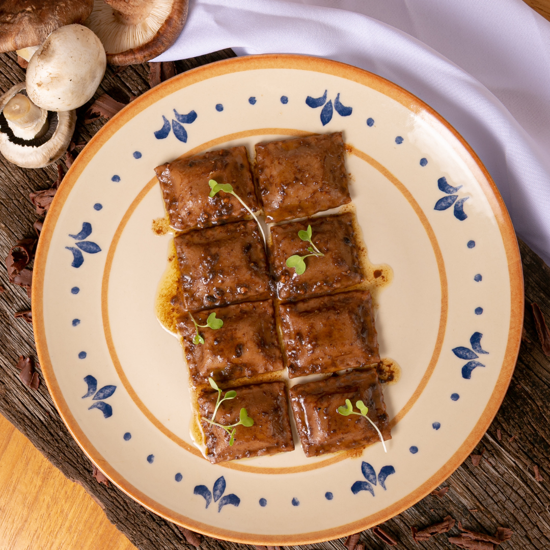 - Ravióli de cogumelos frescos e fungui salteado na manteiga de alho negro