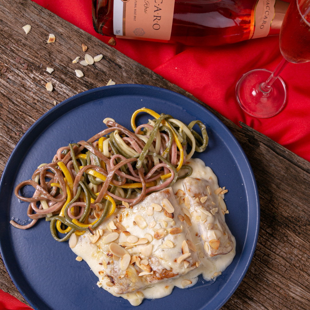- Filé de pescada ao molho de parmesão e amêndoas laminadas , acompanhado de talharim salteado na manteiga
