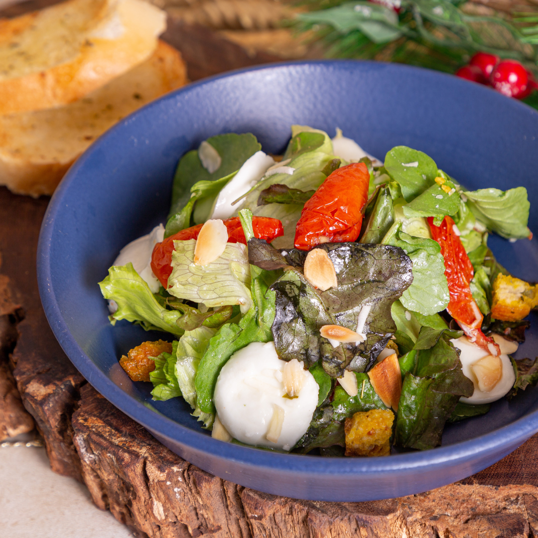 - Salada de folhas , tomate seco, mussarela de búfala, croutons e molho pesto