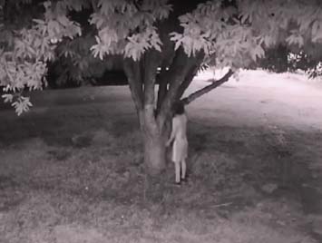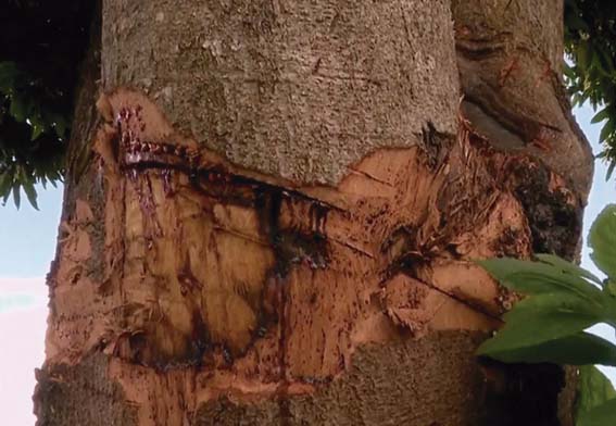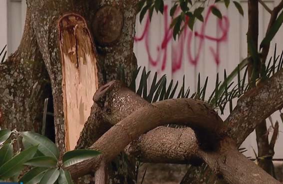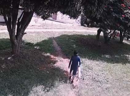 As câmeras de segurança instaladas em residências próximas revelaram cenas inusitadas: um homem, durante a madrugada, utilizando uma escada e um facão para alcançar os galhos mais altos. Em uma das imagens, ele aparece golpeando insistentemente uma árvore até parte dela ceder.