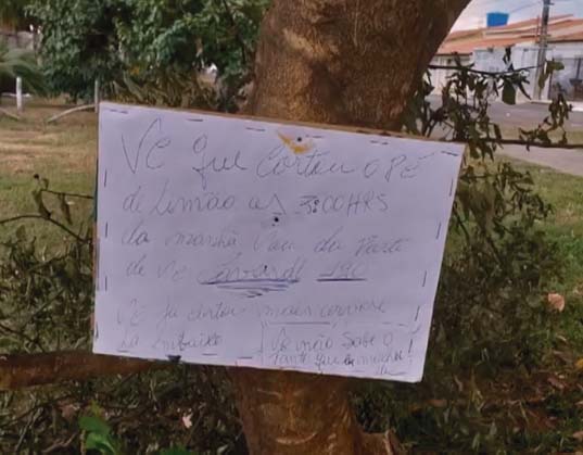 Para tentar conter a ação, um vizinho chegou a colocar um cartaz numa das árvores com o aviso: “Você que cortou o pé de limão às 3 horas da manhã, vou dar parte de você.” A comunidade também passou a monitorar a área e documentar os danos. Edválcio Rodrigues, morador há mais de 40 anos na QE 15, lamenta a destruição de um espaço construído a muitas mãos. “Essas árvores foram plantadas por nós, com cuidado. A gente regava, adubava, cuidava. Agora aparece alguém que mal chegou e começa a destruir tudo”, desabafa.