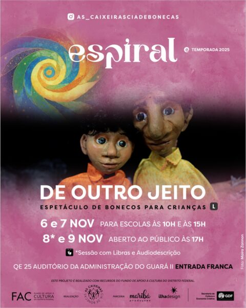 O espetáculo “De Outro Jeito”, da companhia brasiliense As Caixeiras Cia. de Bonecas, retorna ao Guará em novembro para sua última circulação. As apresentações acontecem no Auditório da Administração Regional do Guará II, na QE 25, com sessões abertas ao público nos dias 8 e 9, sábado e domingo, às 17h. Haverá ainda sessões voltadas para escolas nos dias 6 e 7, quinta e sexta-feira, às 10h e às 15h. Todas as apresentações são gratuitas e têm classificação livre.
